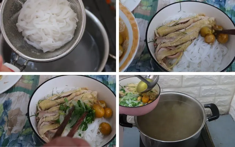 Chan nước dùng phở gà nóng hổi vào tô sao cho ngập bánh phở và thịt gà.