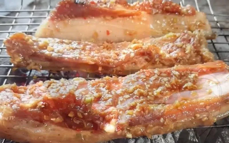 Chuẩn bị bếp than cháy hồng đều, không còn khói đen. Xếp thịt lên vỉ. Lưu ý: Không nên lật thịt quá nhiều lần. Hãy đợi mặt dưới se lại và có màu vàng cánh gián rồi mới lật. Trong quá trình nướng, bạn có thể dùng cọ phết thêm một lớp sốt ướp còn dư để thịt luôn ẩm mượt.