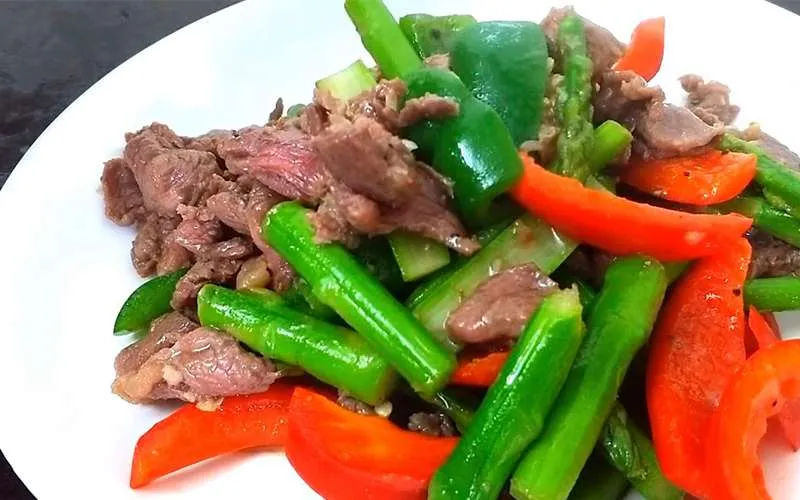 Thành phẩm măng tây xào thịt bò ớt chuông đầy màu sắc