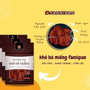 KHÔ BÒ CAY FANSIPAN 50GKhô bò cay Fansipan với từng thớ thịt thấm đẫm gia vị, phù hợp cho các buổi họp mặt
