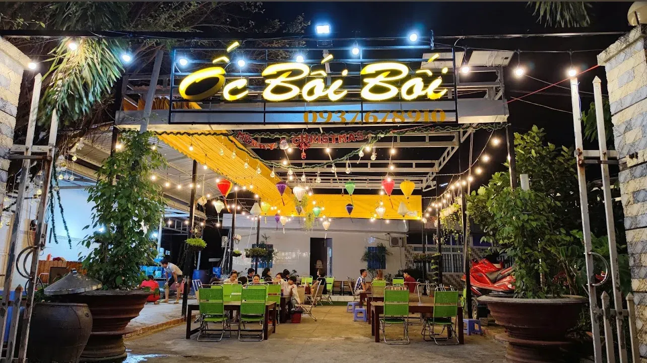 Ốc Bồi Bồi nằm ngay mũi hồng tiêu (Xóm Mới, Gành Dầu), cách Vinpearl khoảng 3km. Đây là lựa chọn tuyệt vời cho du khách lưu trú ở khu Vinpearl mà muốn thử ẩm thực địa phương. Giá các món ốc trung bình 70k/dĩa, lẩu đồng giá 200k/cái – mức giá rất hợp lý so với chất lượng.